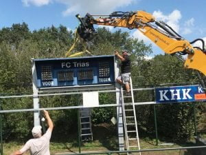 Voordat de nieuwe kon worden geplaatst moest natuurlijk de oude, zware, weg worden gehaald. Een mooie klus voor onze enthousiaste vrijwilligers die samen met een kraan van Sjoerd Frielink netjes het oude scorebord verwijderden.