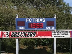 Vervolgens werd samen met de leverancier Scoretec uit Neede (zie http://www.scoretechniek.nl ) de nieuwe geplaatst op de bestaande metalen constructie. Wanneer er geen wedstrijden zijn wordt automatisch de actuele tijd getoond en uiteraard is er een eenvoudige afstandbediening bij zodat het scorebord door iedereen kan worden bediend. Nu maar hopen dat er veel (door onze eigen teams) wordt gescoord !