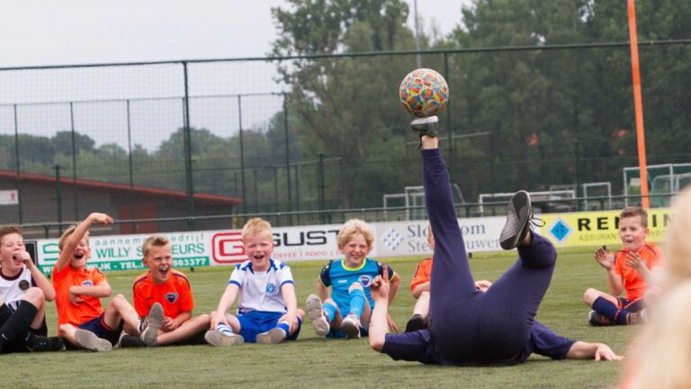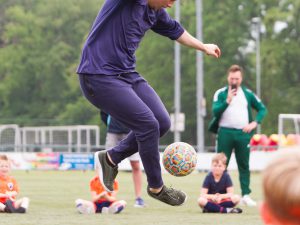 Na de ranja gaf balkunstenaar (of eigenlijk freestyle voetballer) Rowdy Heinen eerst een demonstratie waarbij iedereen met aandacht (en applaus) naar de trucjes zat te kijken. Daarna gingen de spelertjes onder begeleiding van Rowdy zelf aan de slag om te proberen e.e.a. onder de knie te krijgen.