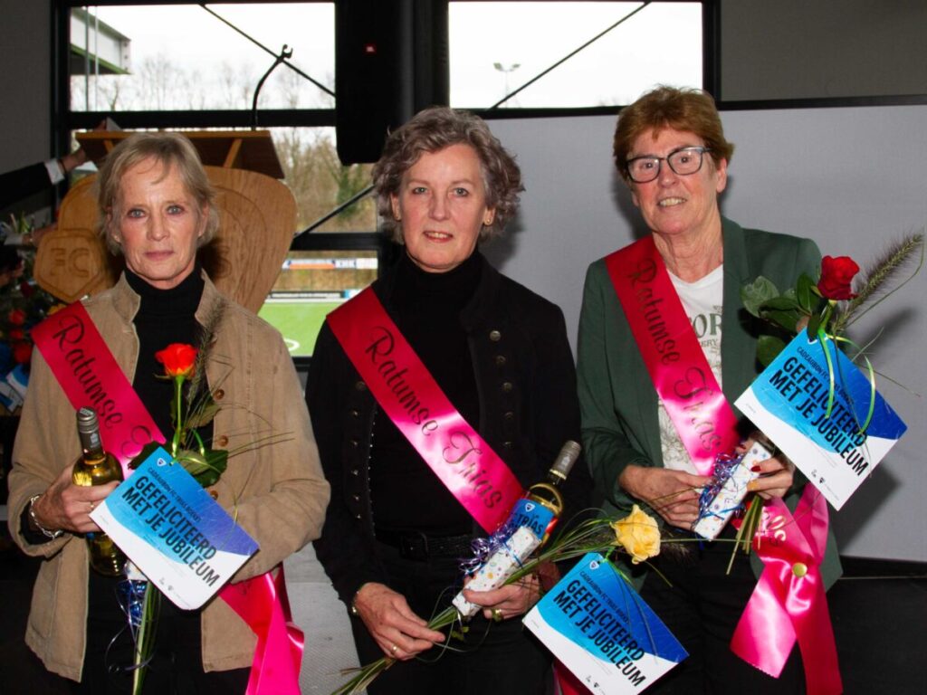 Daarna richtte Bart zich op de jubilarissen: Die in de zogenaamde buitencategorie (Bennie de Roos en Wim ten Damme) waren onlangs persoonlijk thuis bezocht (zoals hier kunt nalezen) maar alle andere 65-60-50-40-25 en 12,5 jarige jubilea werden tijdens de receptie in het zonnetje gezet. Voor iedereen waren er lovende woorden, een ludieke anekdote of een herinnering aan een sportief hoogtepunt. In het bijzonder de drie vrouwelijke jubilea, Ankie Smit-Rikkers, Ria Reuselink-te Brummelstroete en Wilma Oonk-Selle die alle drie, 50 jaar geleden, aan de wieg hebben gestaan van het vrouwenvoetbal in Ratum. Naast mooie woorden was er voor iedereen ook een passend aandenken.
