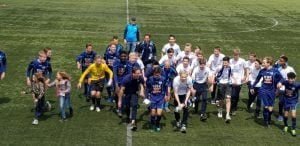 Uiteraard werd het kampioenschap van beide teams nog even samen op het veld gevierd.