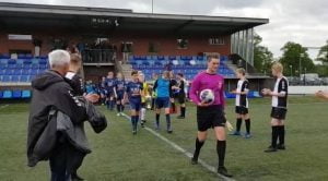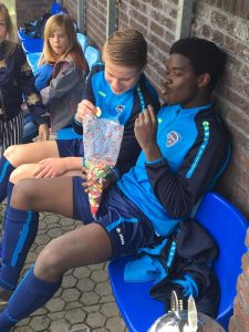 FC Trias JO15-1. Tegenstander in deze thuiswedstrijd was MVV ‘29, dat tijdens het oplopen op het veld een erehaag voor de Boys in Blue vormde en voor hun een grote puntzak met snoep had meegebracht. Erg leuk!