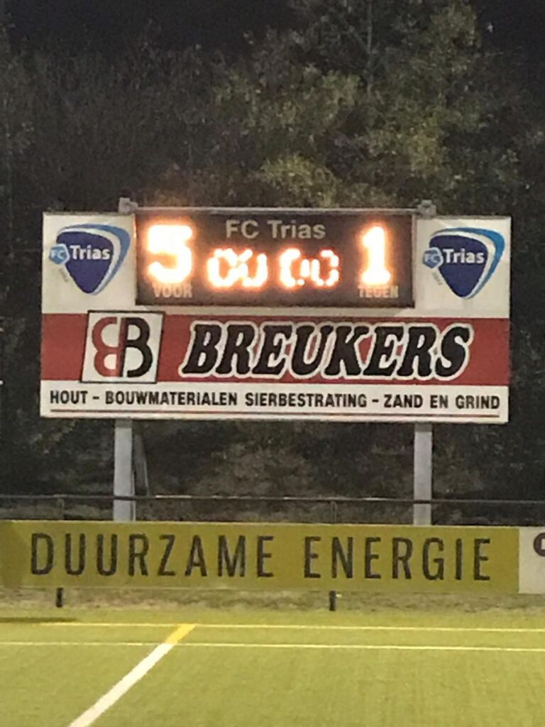 De eerste twintig minuten was FC Trias sterker, maar dit vertaalde zich nog niet direct in kansen. Deze kwamen er wel in het vervolg van de wedstrijd. In de 24e minuut was het raak en 6 minuten later werd er voor de tweede keer gescoord. In de tweede helft bleef FC Trias, mede door een tactische wijziging, druk zetten met een derde doelpunt als beloning. Een klein moment van onoplettendheid maakte dat Zelos tot 3-1 kon terugkomen, maar daar bleef het voor hun ook bij. FC Trias scoorde hierna nog twee keer, waardoor het scorebord na 70 minuten 5-1 aangaf. Met 6 punten uit 2 wedstrijden gaat FC Trias nu aan de leiding in deze poule.