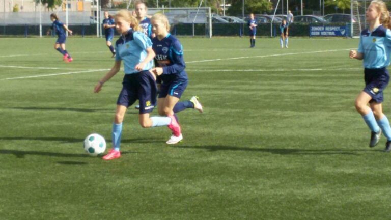 De wedstrijd begon om 13.00 uur, na de wedstrijden van Dames 1 en 2 en voor de wedstrijd van Heren 1, hoe mooi kan het zijn en zeker gezien de hoeveelheid supporters die naar de wedstrijd kwamen kijken. Tijdens de bespreking in de kleedkamer werd door de trainer/leider nog maar eens duidelijk gemaakt: ga van deze wedstrijd genieten en leren en voetbal met veel inzet en passie. Nou, dat hebben we gezien en gemerkt bij onze meiden en onze tegenstander.