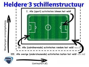 Vervolgens werd aandacht gegeven aan de Visie 2016-2018 waarvoor vorig seizoen 3 speerpunten zijn bepaald: Vrijwilligersbeleid, Binding en Sportieve Ambities. Frank van Eerden presenteerde zijn heldere visie op vrijwilligersbeleid dat 1 op 1 verbonden moet worden met een duidelijke organisatiestructuur. Frank stelde eenvoudige 3-schillenstructuur voor wat moet resulteren in een slagvaardige organisatie waarbij de continuïteit wordt geborgd. Naast een heldere structuur met elk één aanspreekpunt zal exact vast worden gelegd welke functies er zijn en door wie die nu worden uitgevoerd. Al met al een mooie klus voor de vrijwilligerscommissie die de ingezette weg zullen voortzetten.