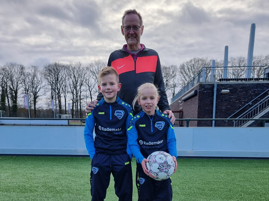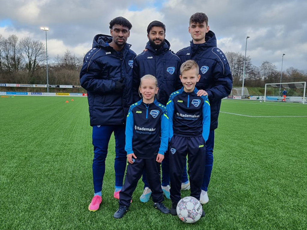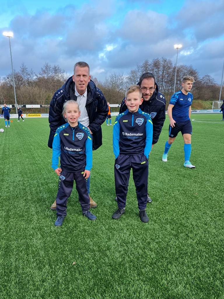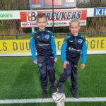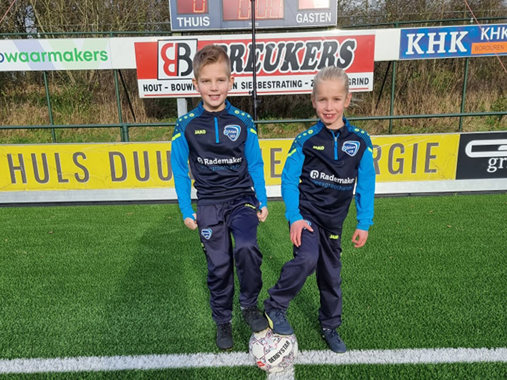 Pupillen van de week Rens Peters en Mellan Ros, beide van onze JO9-1 verrichten de aftrap met ballen beschikbaar gesteld door Italiaanse Meren, Onck Beveiligingstechniek BV en Tolkamp Keukens