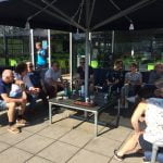 Na de wedstrijd een aangenaam samenzijn op het zonovergoten TriasTerras met het elftal, familie en vrienden van de jubilaris.