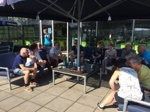 Na de wedstrijd een aangenaam samenzijn op het zonovergoten TriasTerras met het elftal, familie en vrienden van de jubilaris.