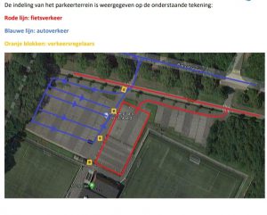 - Voor de fietsers is de fietsstalling uitgebreid, zodat de fietsen op 1,5 meter van elkaar kunnen worden gestald. Net als bij de auto’s dienen de fietsers de instructies op te volgen van de aanwezige verkeersregelaars. De aanrijroutes voor de auto’s en het fietsverkeer zijn onderaan dit artikel weergegeven.