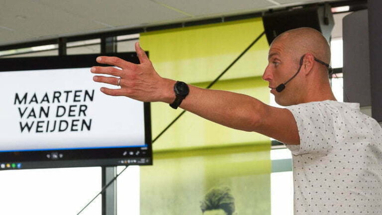 Na een inspirerend filmpje met hoogte- en dieptepunten begon Maarten over z’n jeugdjaren. Zijn vader was daarbij sturend geweest. Sport is belangrijk voor kinderen en een algemene goede voorbereiding voor het leven. “Maar ik was klein en kon eigenlijk niet goed meekomen. Ik heb z’n beetje alle sporten geprobeerd. Vond eigenlijk niets leuk, misschien wel iets te lui. Uiteindelijk bleef het bij zwemmen, was het alleen al omdat ik in het water sneller was dan m’n zus”, zo legde Maarten de keuze voor de zwemsport uit. Tot z’n twintigste heel succesvol op de lange afstanden, 400 – 800 en 1500 meter, totdat….