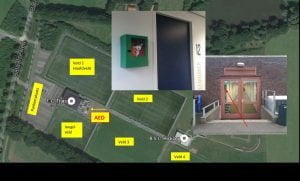 Onlangs is de locatie van de AED (Automatische Externe Defibrillator) gewijzigd. Je vindt de AED nu beneden in de gang ter hoogte van kleedkamer 12, bij de uitgang richting de velden. Hieronder zie je de exacte locatie.