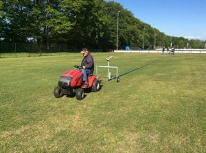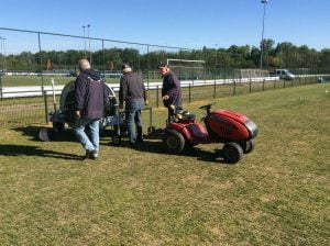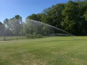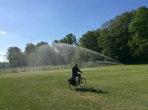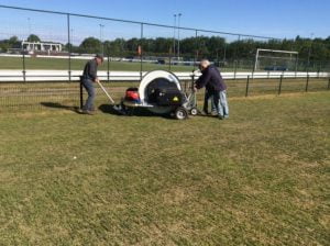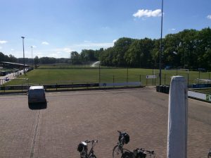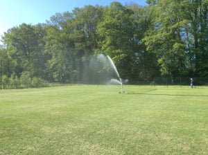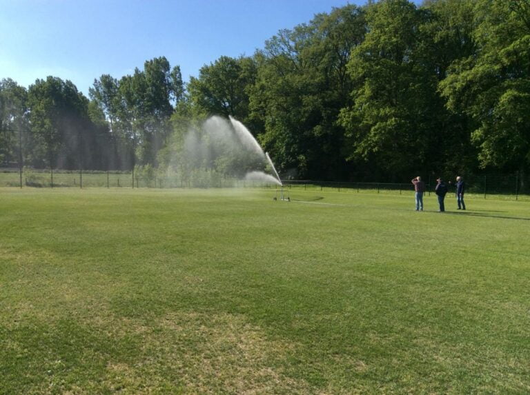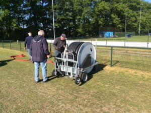 Na hard werken door enkele vrijwilligers van de onderhoudsploeg is het half mei gelukt om de nieuwe sproei installatie in gebruik te nemen voor de 2 voetbalvelden  3 en 4.