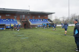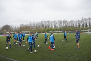 Na de warming up gelijk vol gas aan de bak, waarbij begonnen werd met een rondootje, vervolgens met dribbelen en een oefening met kappen. Alles opbouwend naar een hoger tempo, waarbij er heel even een korte pauze werd ingelast om te drinken. De trainingsjasjes en de broeken gingen daarbij al snel uit ondanks het regenachtige weer. Hier moest gewerkt worden en voor een ieder die dacht dat dit het was sprak Martijn de geruststellende woorden: “We zijn pas net begonnen!”” Vervolgens gingen we met de bal aan de voet aan de slag met de ladder en de slalom. Waarbij Martijn iedereen continu positief aanmoedigde: Karlijn talentje, fantastisch Lieke, Mees goed zo praatjesmaker.
